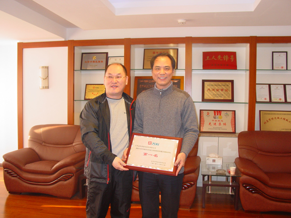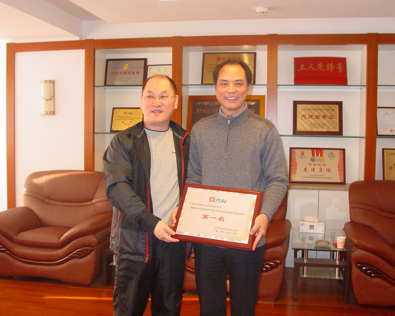 北京萬科領導親赴北京公司授牌 時間:2010-12-14 5500 北京公司在萬科地產第三季度萬科北京區域在建項目產品質量評估中,萬科藍山項目經專家現場實測實量,390個點合格率為99.39%,觀感質量評分、質量風險評估綜合得分97.35%,項目綜合排名蟬聯第一。12月12日上午,北京萬科副總經理孔祥明率工程部經理、項目總經理等一行,特地趕到我公司,把第一名的獎牌隆重授予我公司陳榮春總經理。陳總對萬科的肯定和信任表示感謝,并期望雙方進一步加強友好合作,永續真誠友誼。