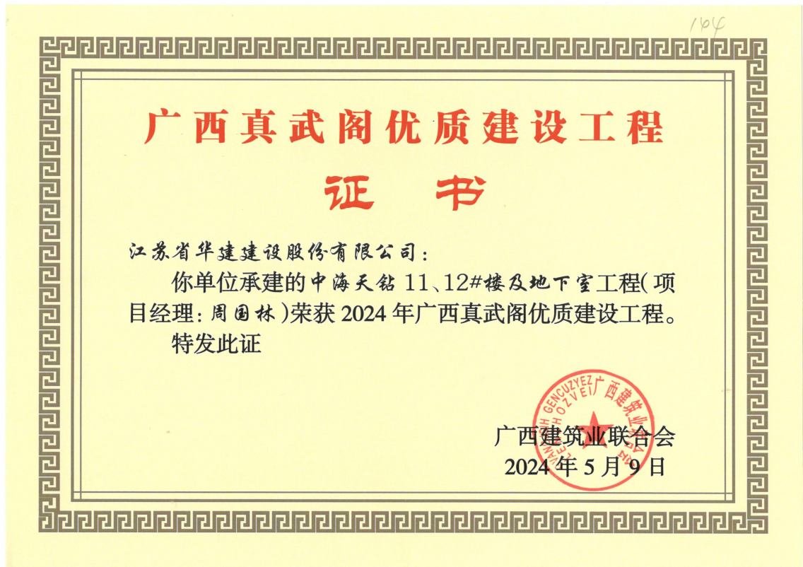 近日傳來喜訊,江蘇華建北京分公司三項工程榮獲質(zhì)量獎。中海天鉆13、14#樓及地下室、北側(cè)入口、圍墻工程和中海天鉆11、12#樓及地下室分別獲2024年廣西建設(shè)工程“真武閣杯”獎;中海望京府1#樓工程獲包頭市“金鹿杯”獎。
