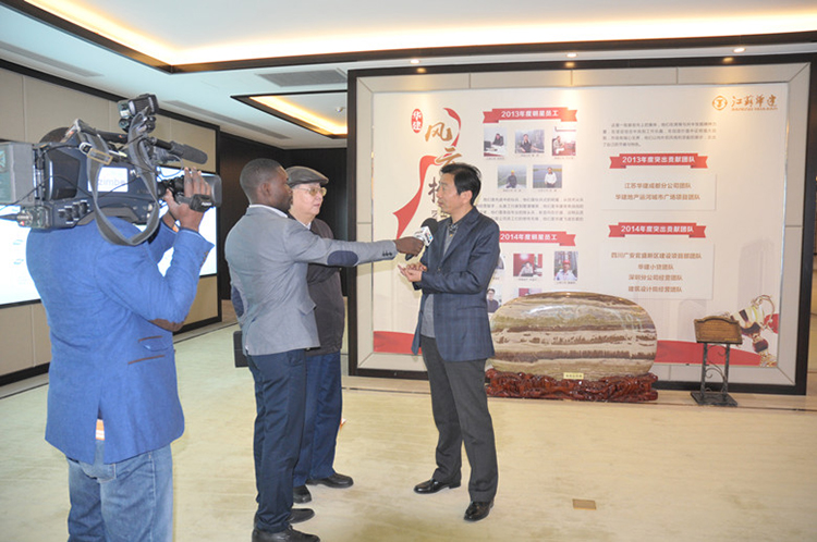 客人在陸董事長陪同下參觀了華建展示中心,簡單的午餐后在會議室進(jìn)行了交流與會談。陸董事長首先介紹了華建的基本情況,特別是打造“三個共同體”以及與員工和合作方分名、分利、分未來的運(yùn)營機(jī)制,最后希望能夠借助我國“一帶一路”戰(zhàn)略與海山國際聯(lián)合共同參與安哥拉的城市建設(shè)。安方用PPT介紹了2013-2017年的遠(yuǎn)期發(fā)展規(guī)劃和首都羅安達(dá)近期的發(fā)展設(shè)想,希望江蘇華建這樣有實力的中國國有企業(yè)積極到安哥拉拓展市場。陸董事長最后還接受了安哥拉國家電視臺隨行記者的采訪,并與科魯茲·內(nèi)圖秘書長、巴依相·朱紐主席等貴賓親切合影。