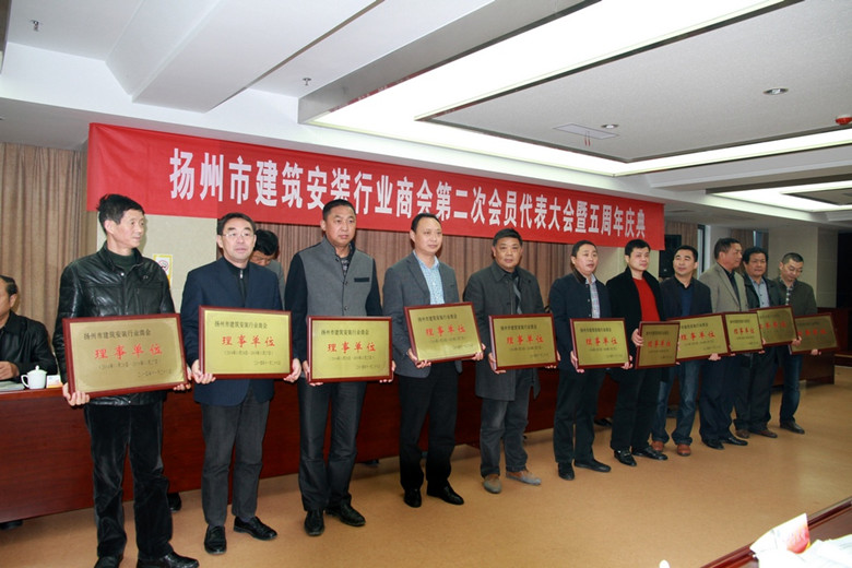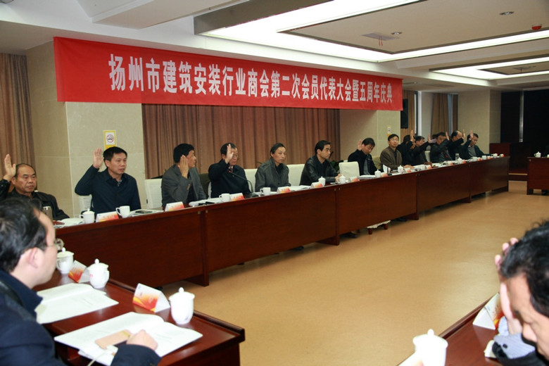 陸金龍主持會(huì)員代表大會(huì),第一屆理事會(huì)常務(wù)副會(huì)長(zhǎng)吳士茂作了工作報(bào)告,吳士茂作為第二次會(huì)員代表大會(huì)籌備小組負(fù)責(zé)人還作了關(guān)于商會(huì)換屆選舉情況的說明。大會(huì)通過舉手表決的方式選舉產(chǎn)生了第二屆理事會(huì)和理事會(huì)領(lǐng)導(dǎo)機(jī)構(gòu)。36名理事組成第二屆理事會(huì),陸金龍連任當(dāng)選第二屆理事會(huì)會(huì)長(zhǎng),吳士茂任常務(wù)副會(huì)長(zhǎng),曹德榮等9名同志任副會(huì)長(zhǎng)。趙振東宣讀了市工商聯(lián)、總商會(huì)關(guān)于同意揚(yáng)州市建筑安裝行業(yè)商會(huì)換屆選舉結(jié)果的批復(fù)。大會(huì)舉行了會(huì)長(zhǎng)單位、副會(huì)長(zhǎng)單位和理事單位授牌儀式。任壽松代表兄弟友好商會(huì)、張紹華代表市民政局分別致賀辭。