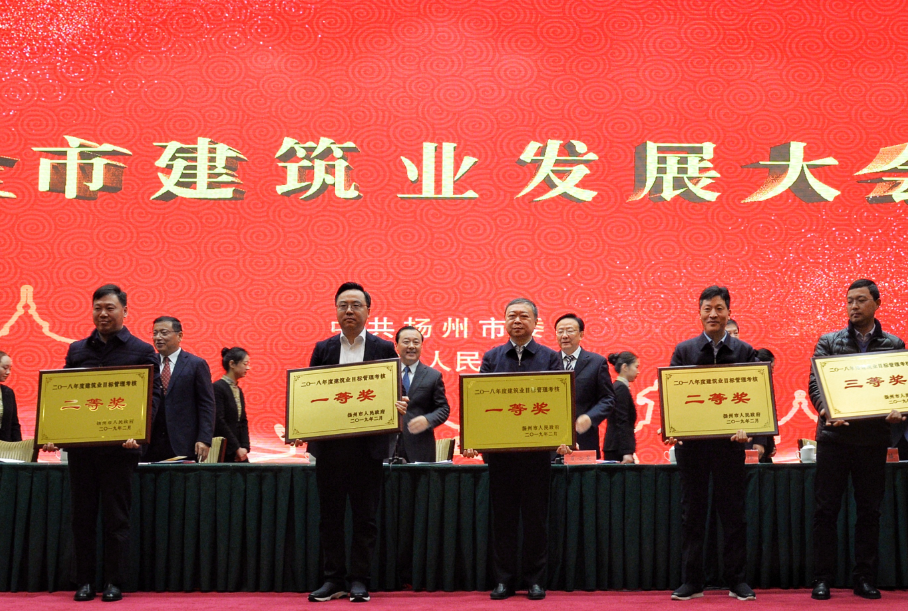 2月11日,揚州市建筑業發展大會在揚州會議中心隆重召開,會上對2018年度全市建筑業先進單位和先進個人進行了表彰,建工控股公司獲市建筑業目標管理一等獎,江蘇華建獲評市建筑業先進企業。此外,江蘇華建王正斌被表彰為市杰出項目經理(建造師),朱靖、耿金余、蔣榮成、張廣道四人榮獲市建筑業先進個人稱號。建工控股、江蘇華建董事長王宏,總經理宗有農出席會議并代表領獎。