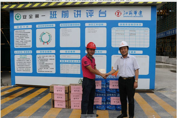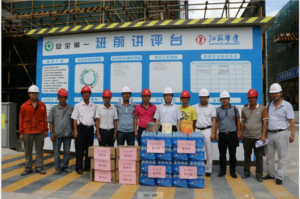 區域公司領導赴三亞工地進行高溫慰問 時間:2015-06-20 3424 6月19日上午,海南分公司黨總支副書記沈巨青帶隊,在分公司工會代表等相關部門陪同下,走訪慰問了三亞婦幼保健院項目部,看望了堅守崗位奮戰在高溫一線的項目部人員,并給他們送去了礦泉水、洗漱用品和防暑藥品。 慰問組一行實地了解項目部的進展情況以及現場人員的食、住、行、業務學習安排等情況,叮囑大家在高溫季節要切實加強現場管理,繃緊安全弦,確保平穩有序生產。