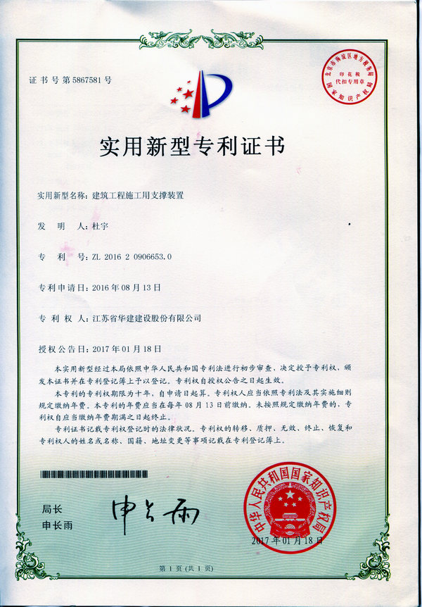近日,海南分公司《建筑工程施工用支撐裝置》成果獲得國家知識產權局專利授權,被授予國家實用新型專利。