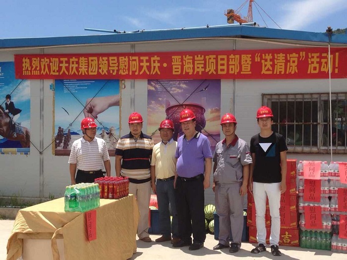 千里送清涼——天慶集團董事長韓慶慰問我司一線職工 時間:2015-08-05 4365 8月4日中午,烈日當空,驕陽似火。甘肅天慶房地產集團有限公司董事長韓慶一行不遠千里來到廣東珠海,頂著烈日,冒著酷暑,在項目負責人陳建的陪同下,慰問我司承建的“天慶·晉海岸”項目一線施工人員,給工人們送來了西瓜、礦泉水、王老吉等飲品和深情問候,讓廣大一線職工在炎炎烈日下感受到陣陣清涼。