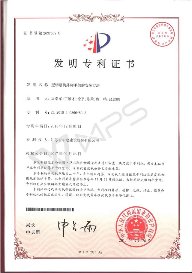 公司首獲一項國家發明專利授權 時間:2017-10-23 2985 近日,江蘇華建珠海區域公司《型鋼懸挑外腳手架的安裝方法》獲得國家發明專利授權,這是珠海區域公司獲得的第一個國家發明專利授權。 該發明提供一種型鋼懸挑外腳手架的安裝方法,包括提供可拆卸的壓環、吊環;將壓環預埋后,將型鋼懸挑梁安裝并定位,并使用壓環緊固其固定端,將鋼絲繩穿過吊環后緊固型鋼懸挑梁的懸挑端。本發明安裝方法簡單,拆卸后的壓環和吊環可重復利用,有利于環保。