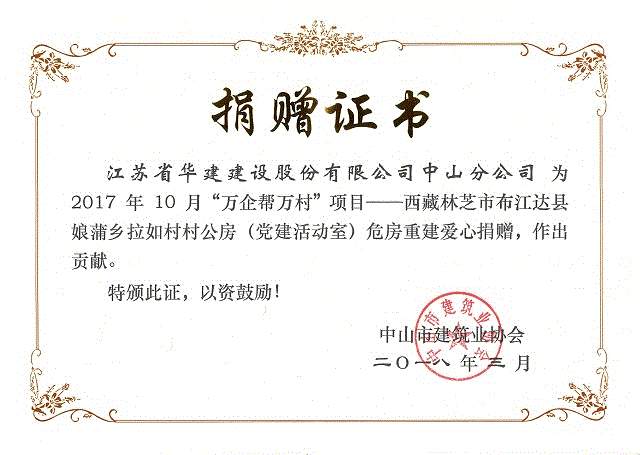 中山分公司在“萬企幫萬村”精準扶貧行動中受表彰 時間:2018-04-18 3434 近日,中山市建筑業協會召開2018年年會暨工程創優表彰大會。會上,協會為去年愛心捐贈支持“萬企幫萬村”扶貧行動——西藏林芝市工布江達縣娘蒲鄉拉如村村公房(黨建活動室)危房重建項目的會員企業頒發了捐贈證書,以表揚捐贈單位的大愛精神,中山分公司受到表彰。