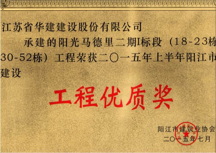 陽光馬德里二期I標段(18-23棟、30-52棟)工程獲 2015年上半年陽江市建設工程優質獎