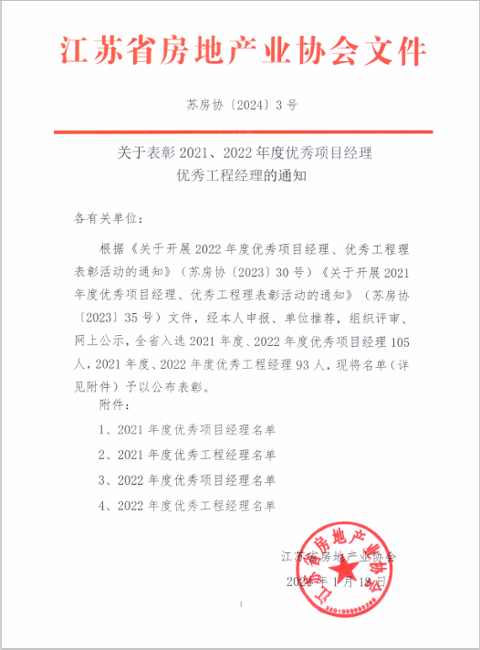 近日,江蘇省房地產(chǎn)協(xié)會公布了《關(guān)于表彰2021、2022年度優(yōu)秀項目經(jīng)理、優(yōu)秀工程經(jīng)理的通...
