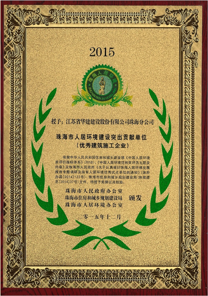 珠海市人居環境建設突出貢獻單位(優秀建筑施工企業)