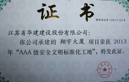 公司首獲全國“AAA級安全文明標準化工地” 時間:2013-12-12 5317 日前,由上海區域公司蘇北分公司承建的淮安翔宇大廈被中國建筑業協會評為2013年全國“AAA級安全文明標準化工地”,這是國內安全文明施工最高獎項,旨在規范建筑施工安全生產,保障建筑職工安全與健康,提高施工現場安全管理水平。這是上海區域公司第一次獲此殊榮,也是江蘇華建第8項全國3A級安全文明標準化工地,該工程還被評為2012年度江蘇省建筑施工文明工地、2013年度江蘇省建筑業新技術應用示范工程。