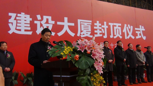 揚州建工控股有限責任公司董事長、黨委書記陸金龍董事長在封頂儀式上致辭。他說,建設大廈是體現(xiàn)市委、市政府民生城建理念的標志性項目之一,其中的城市規(guī)劃展覽館是提升城市品質、展示城市未來宏偉藍圖、宣傳城市美好形象的重要陣地,市民中心是市民活動、交流、服務和區(qū)域文化展示的固定場所,這個項目的建設對進一步提升城市基礎設施建設水平,完善城市功能,提升城市品質,建設“三個揚州”都具有深遠和重要的意義。項目自2010年5月2日開工以來,作為項目投資建設主體,建工控股公司認真貫徹落實市委、市政府的指示精神,及時選派精干力量,切實優(yōu)化建設方案,合理調配資源,主動協(xié)調關系,確保項目建設高效、有序、廉潔推進。承擔建設代理任務的江蘇華建和承擔施工任務的揚建集團、揚安集團等單位發(fā)揚市直施工企業(yè)敢打善拼、精益求精的優(yōu)良作風,精心組織,精心施工,確保了質量、工期和現(xiàn)場文明,體現(xiàn)了我市建筑精英的實力和水平。陸董事長指出,工程順利封頂標志著項目建設進入了一個新的階段,他希望項目管理團隊和全體建設單位進一步樹立大局意識、責任意識和精品意識,繼續(xù)加強與相關部門單位的協(xié)調配合,克服一切困難,瞄準既定目標,努力把建設大廈建成領導放心、群眾滿意、業(yè)主認可的優(yōu)質工程、民心工程、標志工程,為精致?lián)P州增添一抹亮麗的風景。